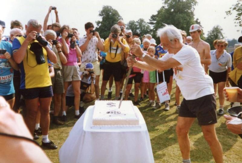 In 1990 Northampton CTC hosted the annual CTC Birthday Rides at Moulton College. Above Tom Chapman cuts the enormous Birthday Cake in the grounds of Holdenby House, where King Charles was incarcerated after the battle of Naseby in 1645 before being transferred and beheaded outside Banqueting House, Whitehall, London in January 1649.