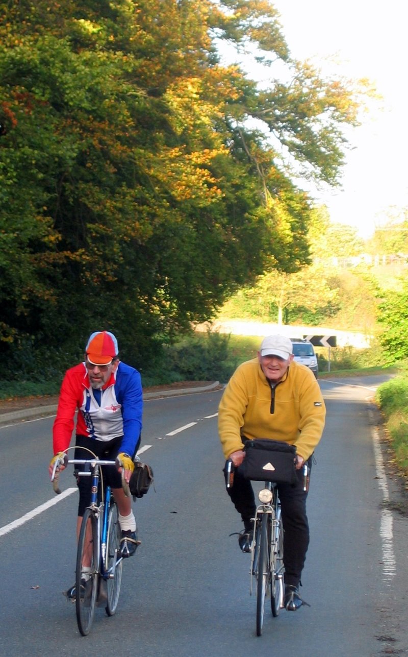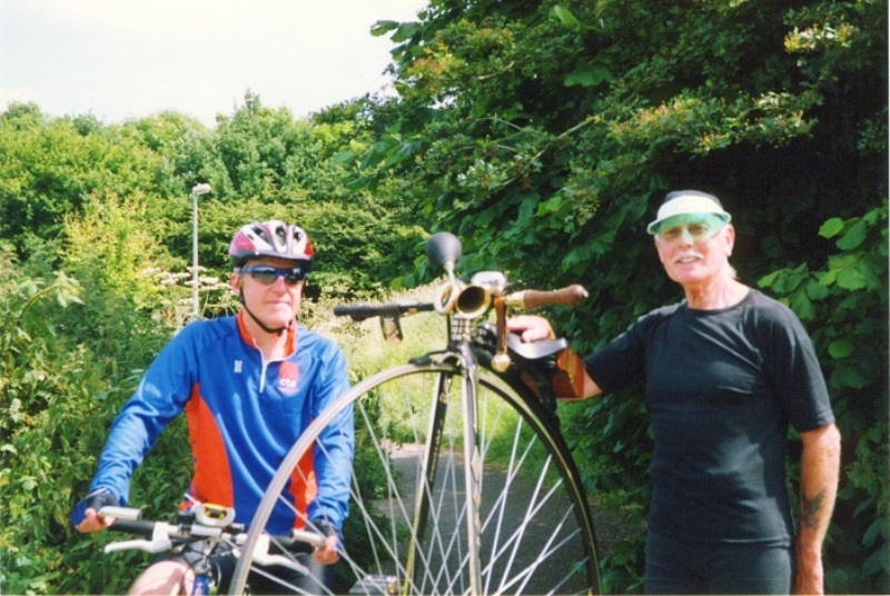 In 2006 Bill Simpson started the GUY BARBER MEMORIAL CHARITY RIDE in memory of his friend. Guy Barber was a Vintage Cycle enthusiast and enjoyed riding his Penny Farthing around the County. His bicycle had the names of CTC founders and early cyclists engraved on its frame. On one particular day he rode to Cambridge, on his return to Northampton he felt so good he decided to ride to Oxford as well! Pictured above Brian with Guy and his Penny Farthing. The annual charity ride benefits 'Headway' while the route commemorates that one particular day by going to St Neots and sometimes Cambridge.
