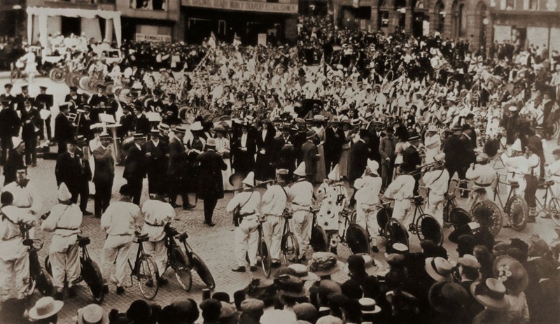 Cyclists assembled on the Market Square in 1911 for the 21st Cyclist Parade.
