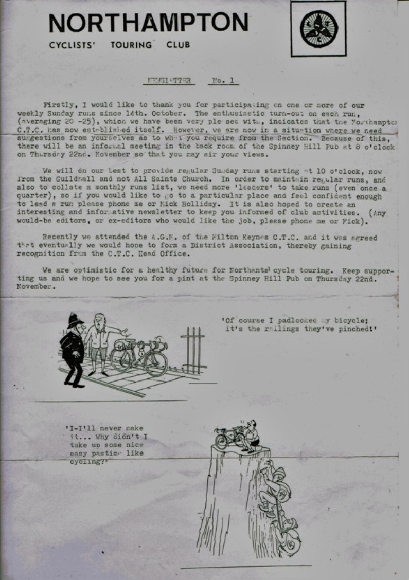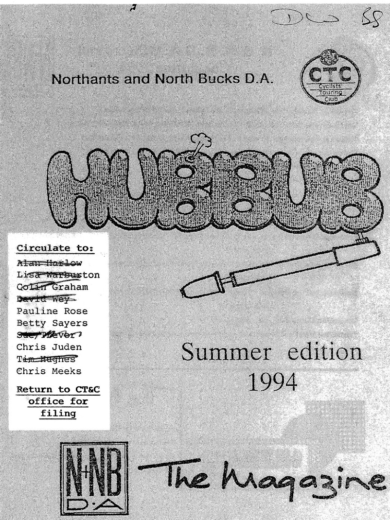 The Northampton Section was re-formed in October 1979, by Mick Holliday, after receiving a call from Geoff Caverhill, in London, informing him that there was no CTC Section in Northamptonshire. A bi-monthly CTC Northampton Section Magazine was started in February 1980 called the HUBBUB giving members information on forthcoming Club runs, D.A.Events, Social Events, book reviews, food recipes, sales and anything else considered interesting. Printed at White & Bishops it ran throughout the 1980's.
