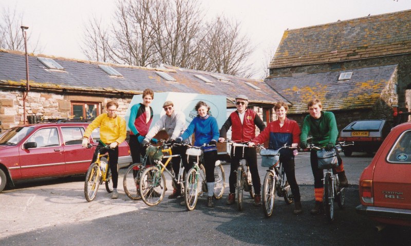 CTC Northampton trip to Cumbria, Easter 1987. L to R David Wood, Paul Bass, Paul Jones, Sue Hastings, Bob Hastings, Christine Bass and Mark Bailey.
