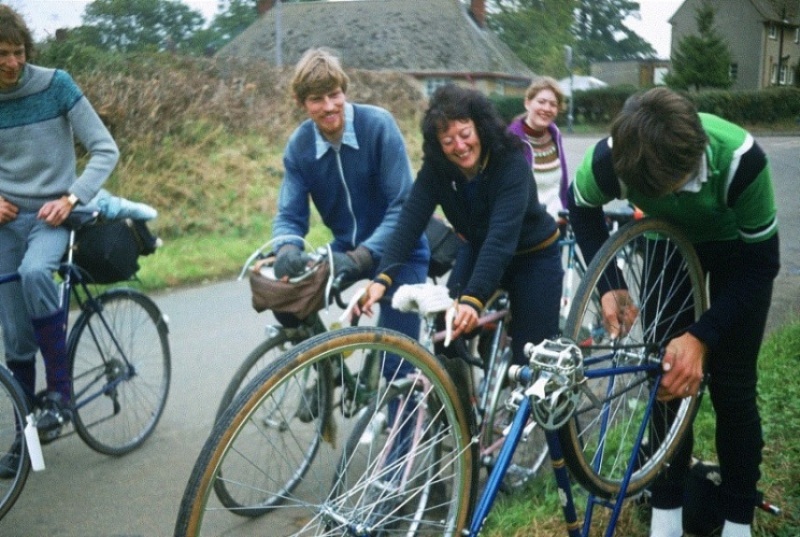 Geoff Caverhill, Pete Coulson, Barbara Garbutt, Sue Holliday, and Chris Garlick mending his bicycle.