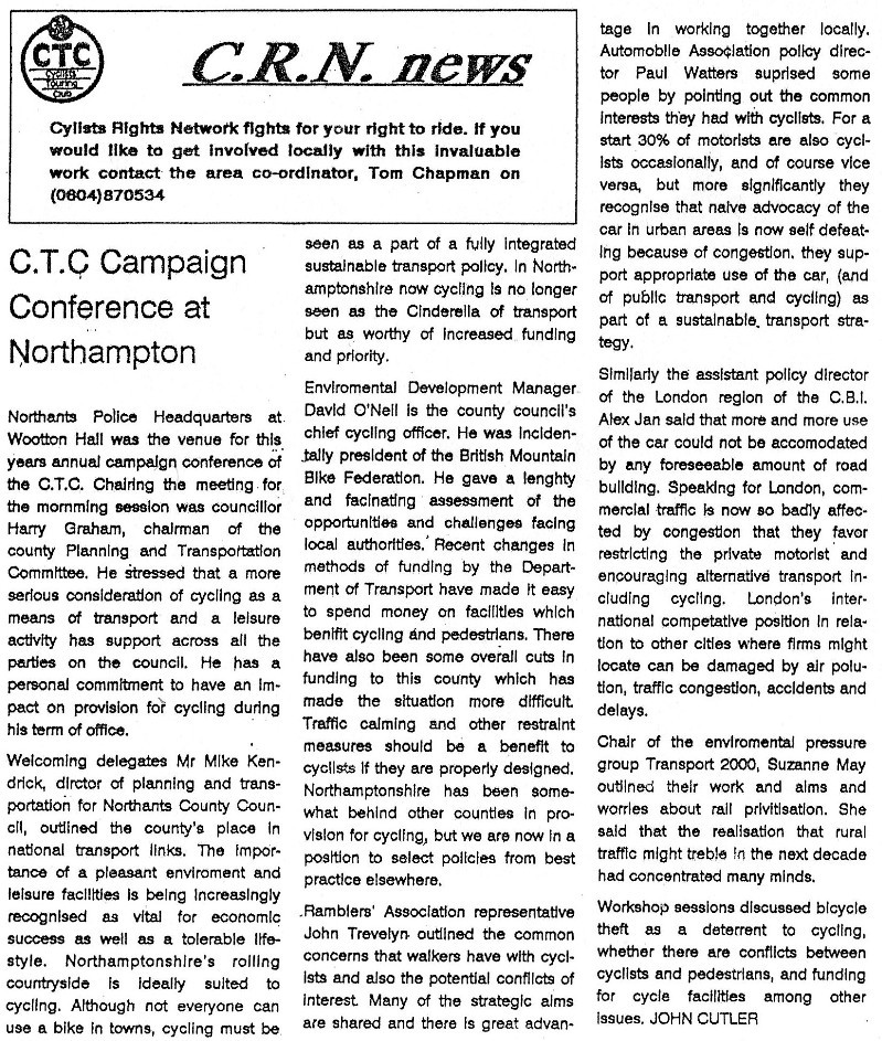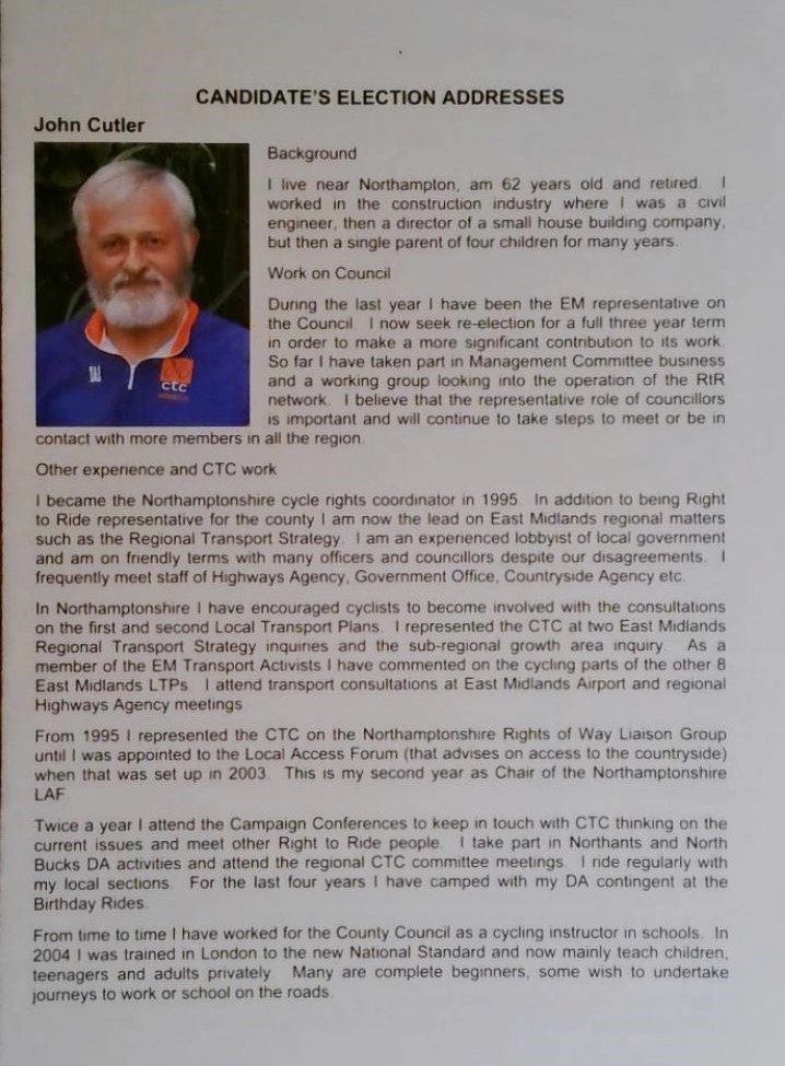 John joined N.CTC in 1989 and brought about important improvements in county cycle routes, was responsible for the first modern Northampton Cycling Map and was a long-time cycle trainer for young people. He was known for monitoring council road schemes and asking the awkward questions about better cycling provision. He knew the government’s cycling design guidelines inside out and never failed to point out when the council was failing to apply them.