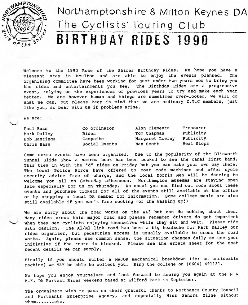 The CTC Birthday Rides returned to Northamptonshire nineteen years later, using Oundle School as its accommodation. This was organised by Max Scott and volunteers from local CTC groups.