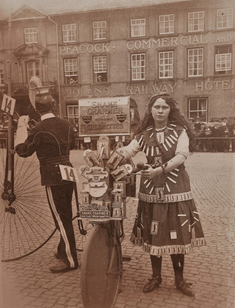 Two entrants in a Parade c1900 wait the judging on the Market Square. With snake skins around her neck, wrists, the lady is advertising a brand of Turkish cigarette called Snake Charmer, sold in King sized cork-tipped form at 3s 3d for twenty.