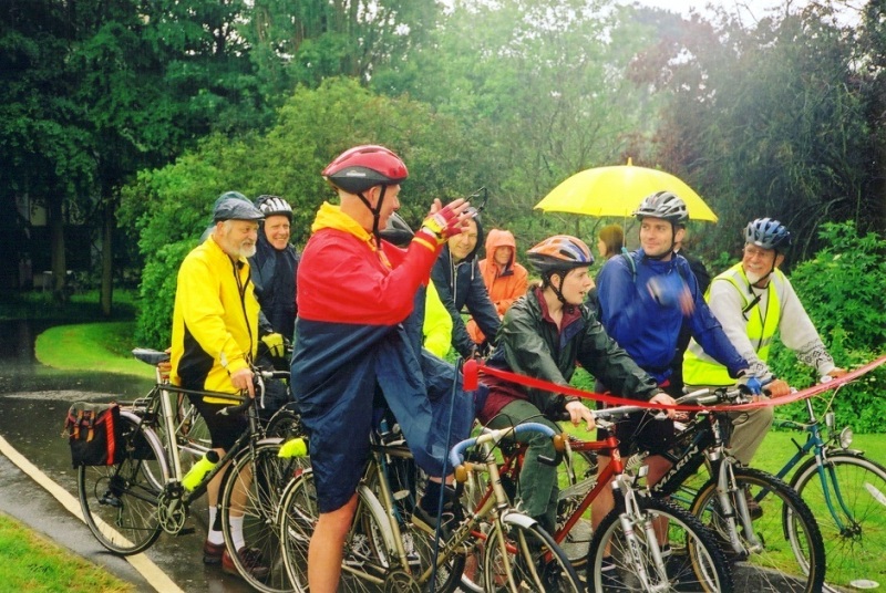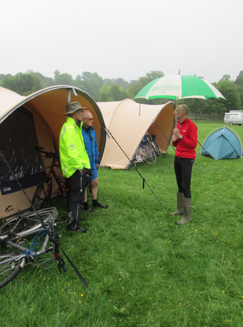 Geoff Taylor (holding Umbrella) enjoys the weather at the Cycling UK East Midlands Beaumanor Rally.