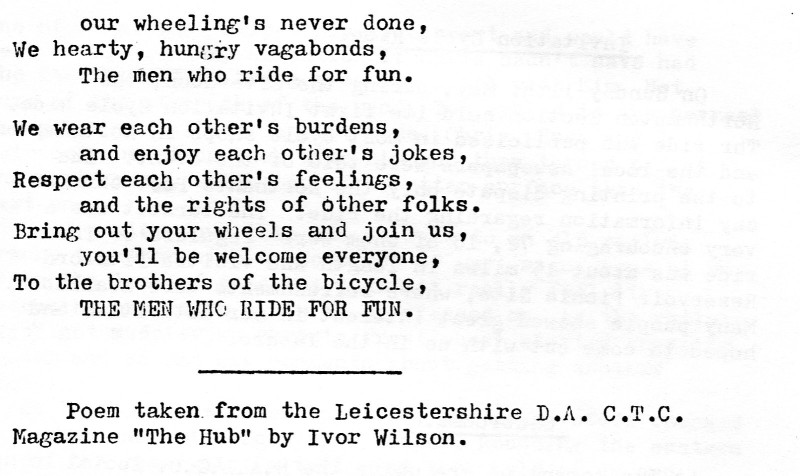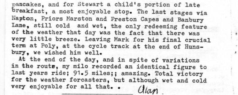 The Northampton section continued to provide a ride every Sunday, of varying lengths, but usually around 40-50 miles in the winter and 50-70 miles in the summer. There wouldn’t be a ride if there was a D.A. event, youth hostelling weekend or a weekend away at a hired cottage etc, or at Bank Holidays.