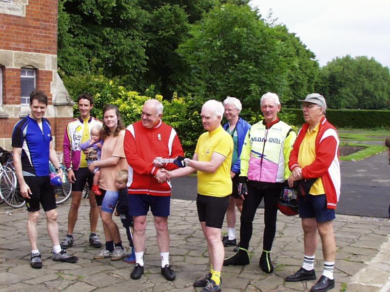 John Dunkley wearing a yellow top, hands over a specially engraved baton to CTC Leicester to pass on to CTC Derby - CTC Nottingham - CTC Lincoln.