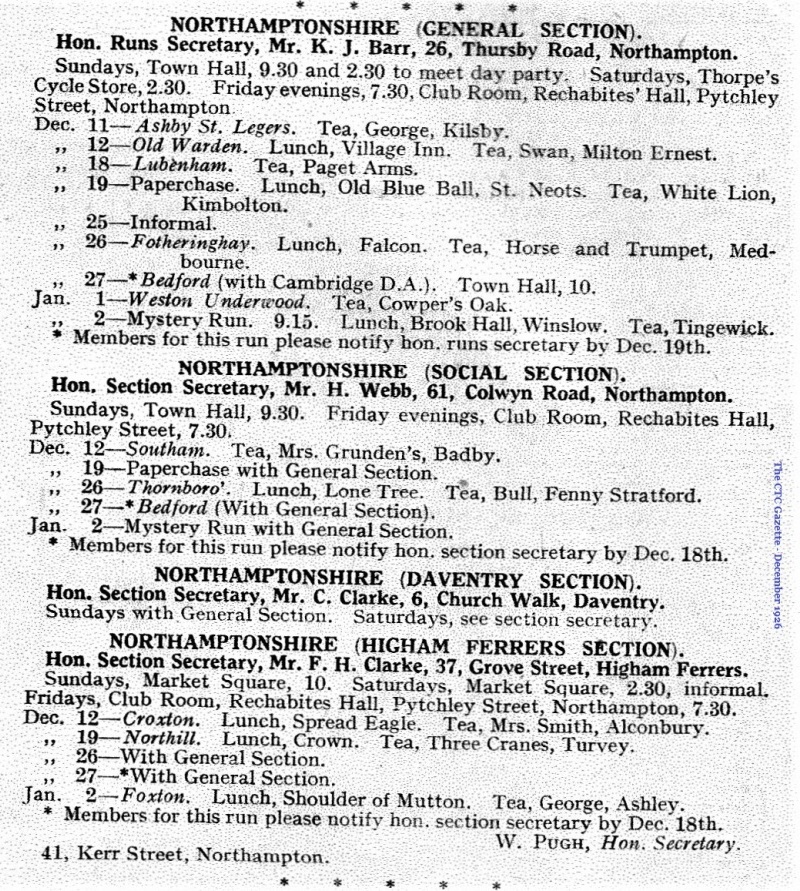 N.D.A. Sections Rides Calender for December 1926. A Wellingborough Section was formed in 1928.