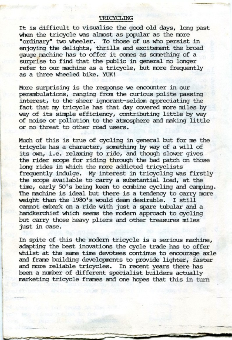 The Northampton Section was re-formed in October 1979, by Mick Holliday, after receiving a call from Geoff Caverhill, in London, informing him that there was no CTC Section in Northamptonshire. A bi-monthly CTC Northampton Section Magazine was started in February 1980 called the HUBBUB giving members information on forthcoming Club runs, D.A.Events, Social Events, book reviews, food recipes, sales and anything else considered interesting. Printed at White & Bishops it ran throughout the 1980's.